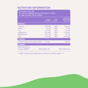 - Prebiotics & Probiotics: Contains a blend of prebiotics (GOS) and probiotics (Bifidobacterium longum BB536) for a healthy digestive system.